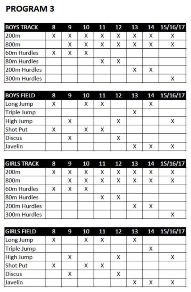 We’re hoping for warmer (or at least less wet) weather this week, so we can be back at Landy Field this Saturday for the last day of Little Athletics competition for 2023. As we missed last week, this week will be Program 2 again. This means that Walks events will be happening for athletes aged 9 and up and all competitors need to wear shorts that are a minimum of 10cm above the knee – no leggings or trackpants.